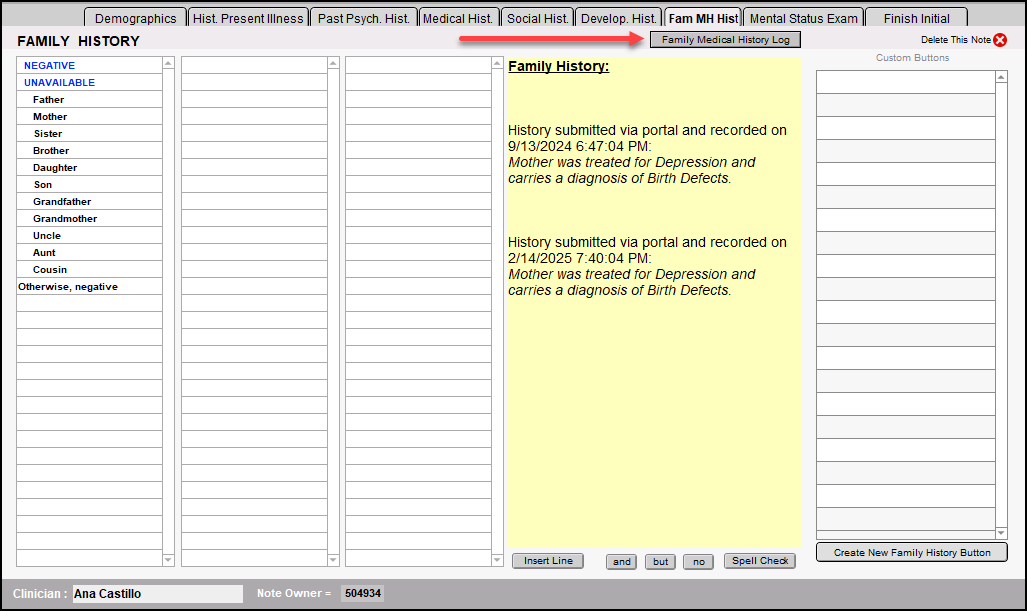In the Fam MH Hist (Family Mental Health History) tab, click to create a new Family History Log Entry