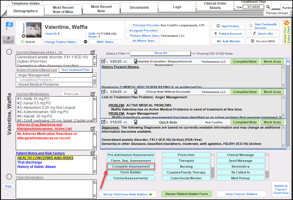 Start with a new Complete Assessment (of your discipline) note from the client’s Chart Face