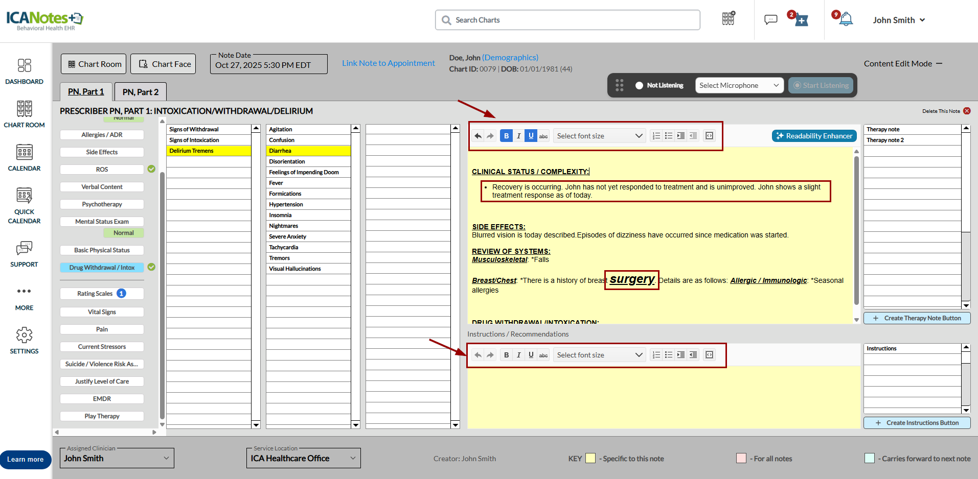 Overview The Readability Enhancer feature in ICANotes+ uses artificial intelligence (AI) to help improve the clarity and professionalism of your note content. You can refine the entire note or enhance specific sections based on your needs. ⚠️ ...