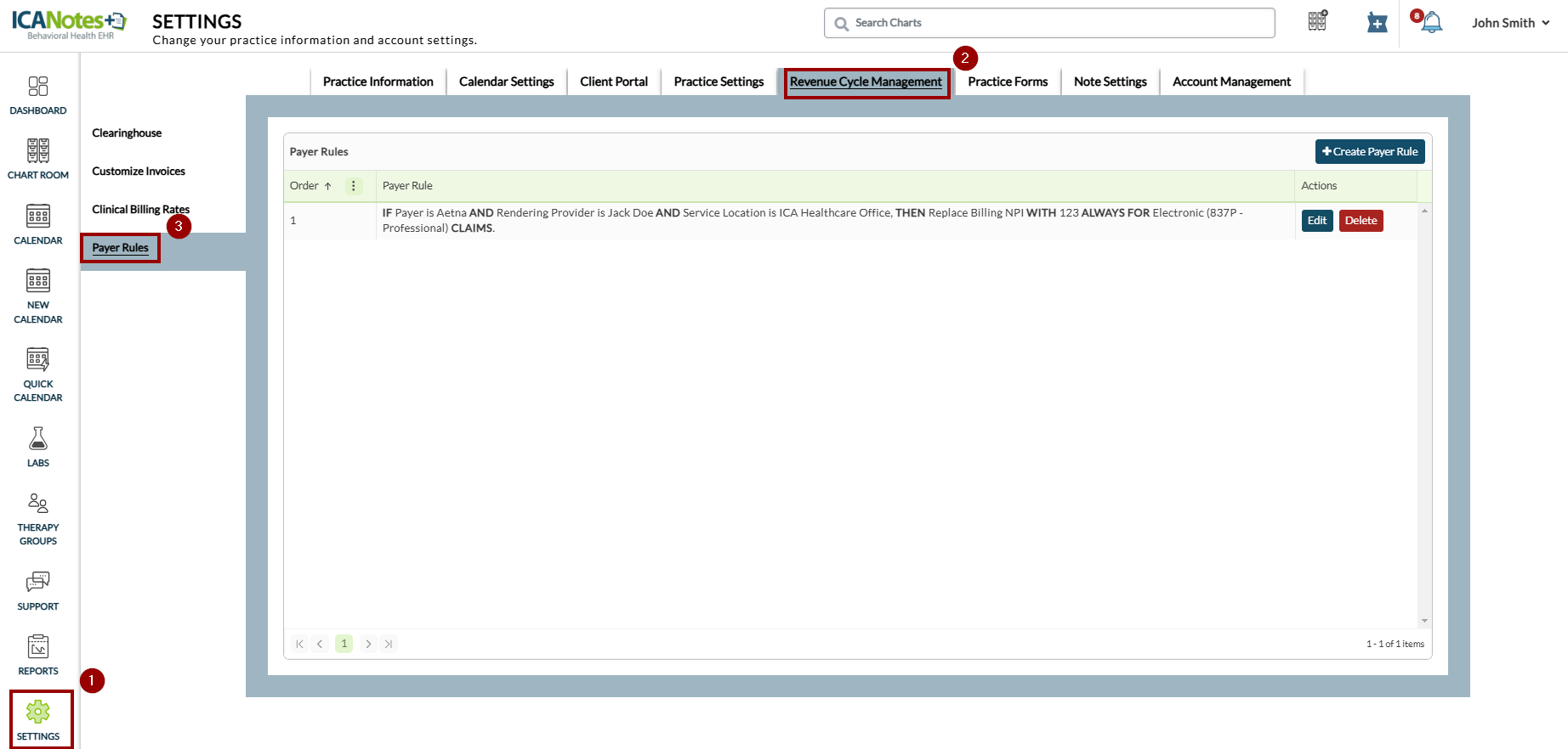 Users without this permission will not see the Payer Rules section under the Settings > Revenue Cycle Management tab, as shown below.