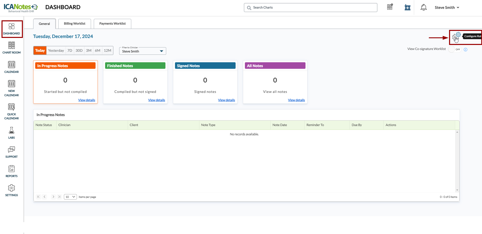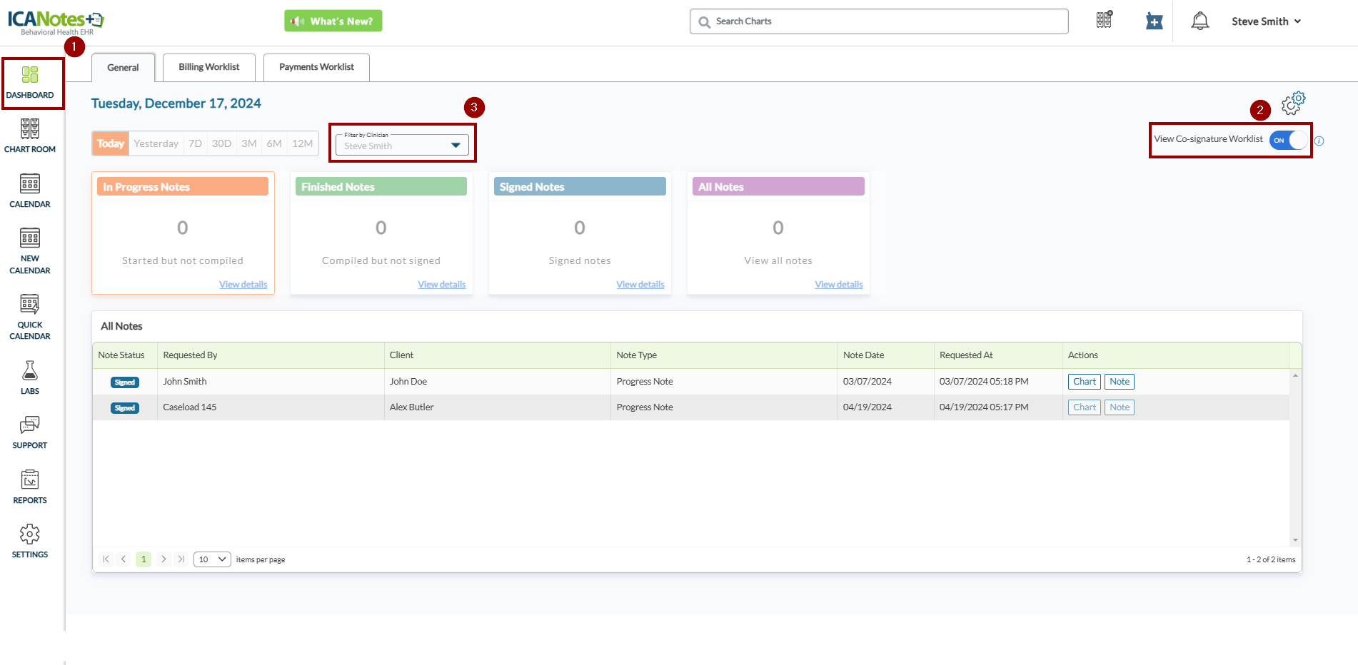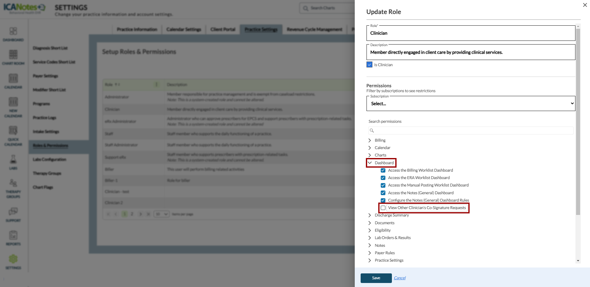 When the Co-Signature feature is enabled, users without this permission will see the "Filter by Clinician" dropdown as disabled.