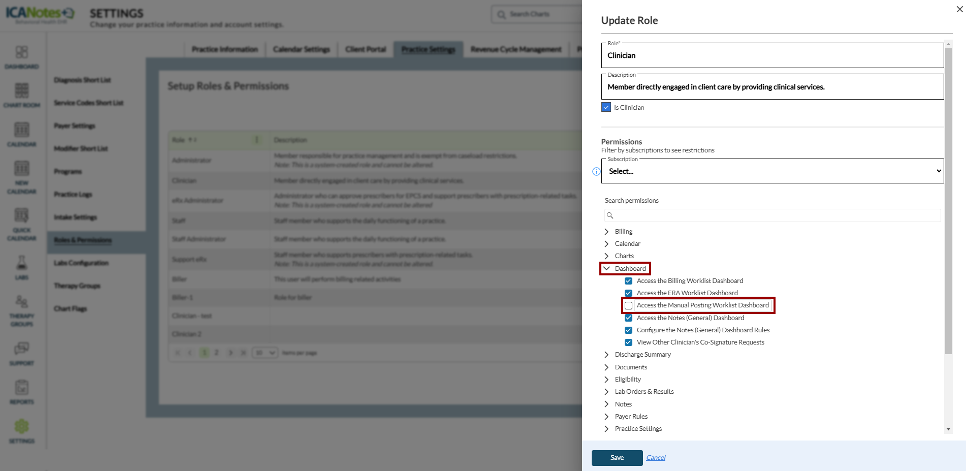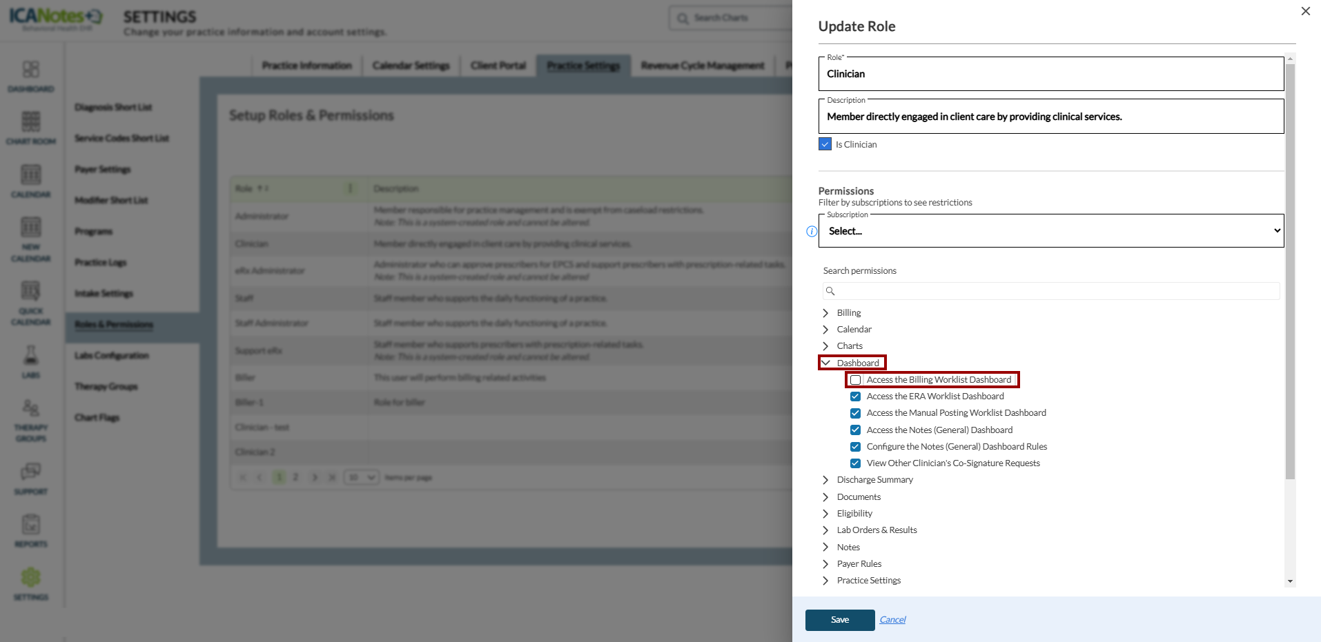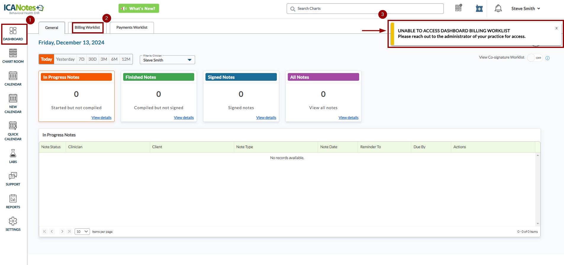 Users without this permission attempting to access the Billing Worklist tab on the Dashboard will receive the following restriction message.