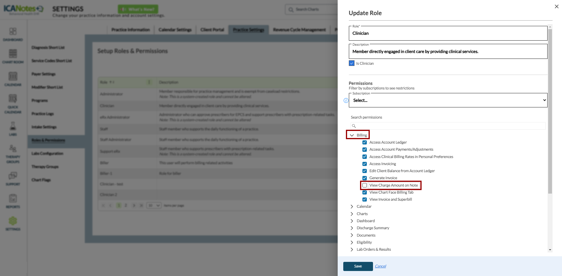 - On the Update Role screen, expand the Billing tab and select the View Charge Amount on Note checkbox.