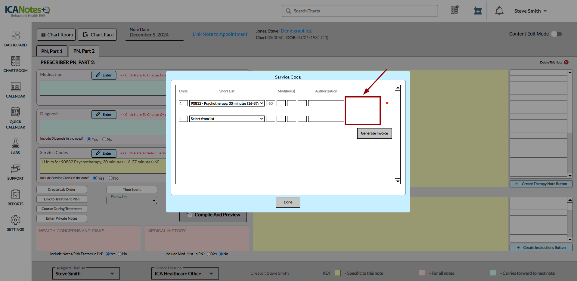 - When generating an invoice in a note, users without the required permission will find the View Invoice and View Superbill buttons disabled, with the tooltip appearing as shown below.