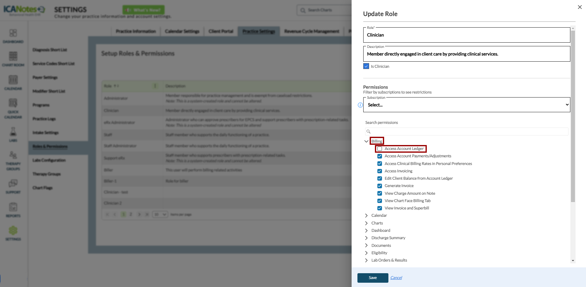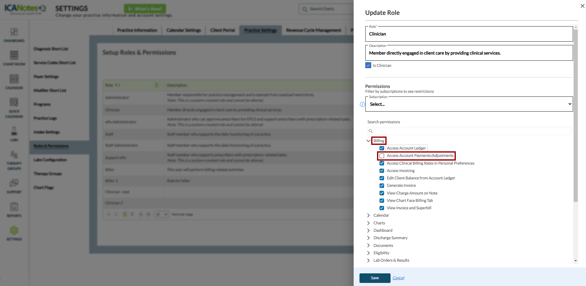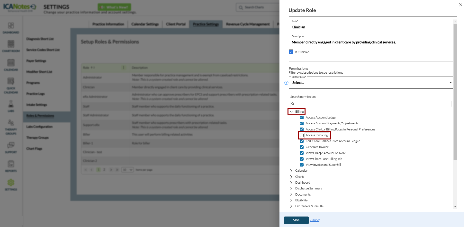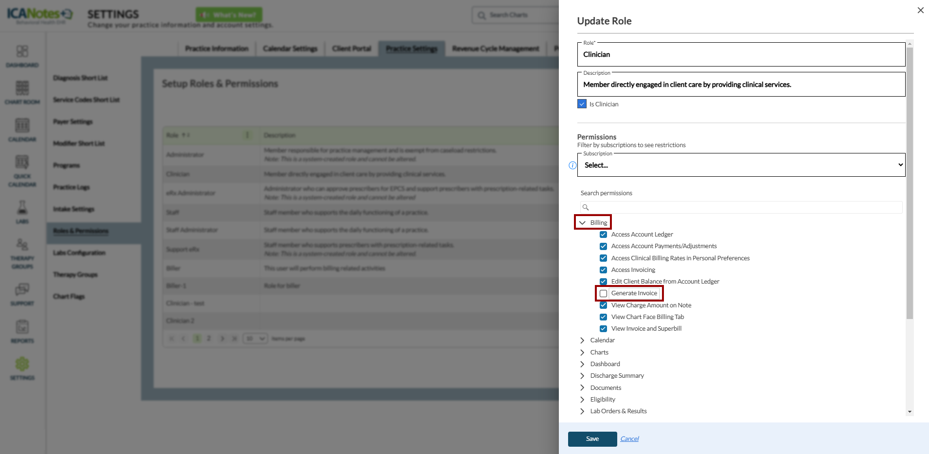- Go to Settings > Practice Settings > Roles & Permissions.