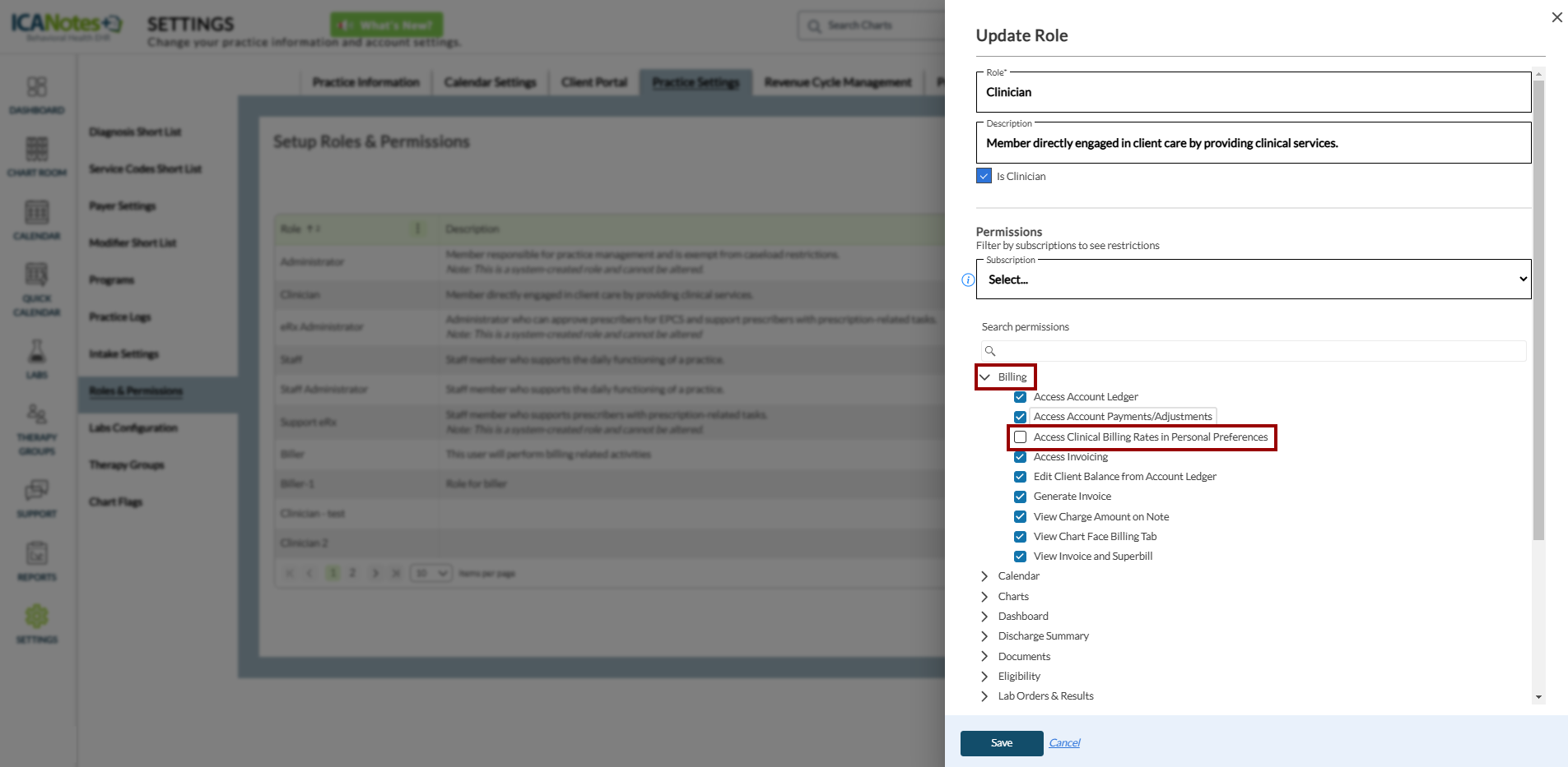 - On the Update Role screen, expand the Billing tab and select the Access Clinical Billing Rates in Personal Preferences checkbox.