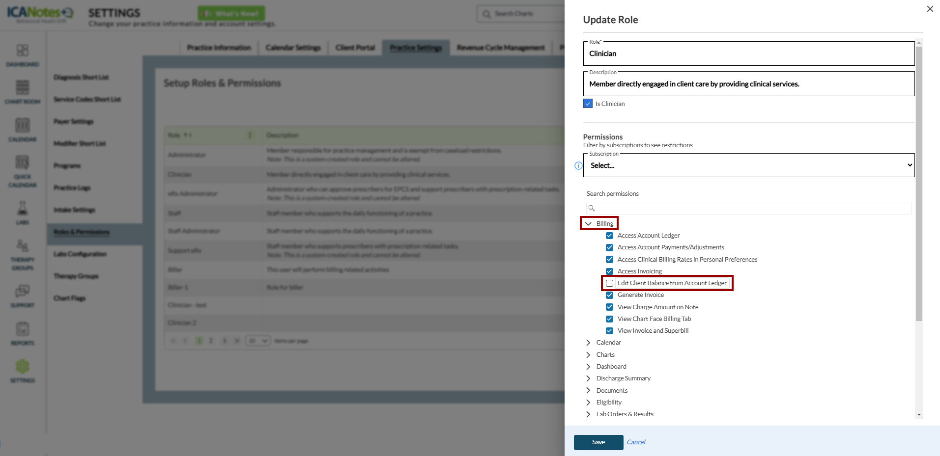 - On the Update Role screen, expand the Billing tab and select the Edit Client Balance in Account Ledger checkbox.