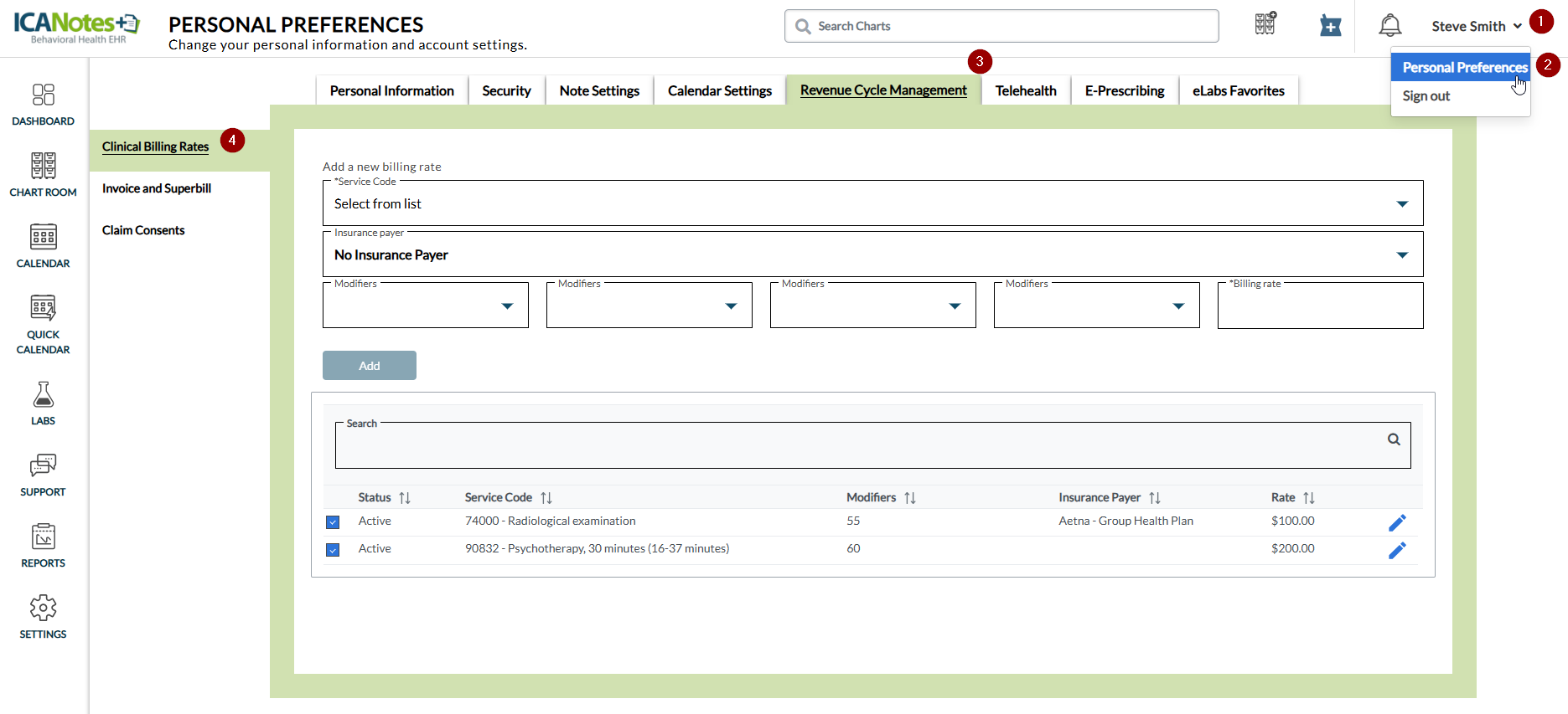 When users without this permission navigate to the Personal Preferences > Revenue Cycle Management tab, the Clinical Billing Rates section will not appear to them. Refer to the screen below: