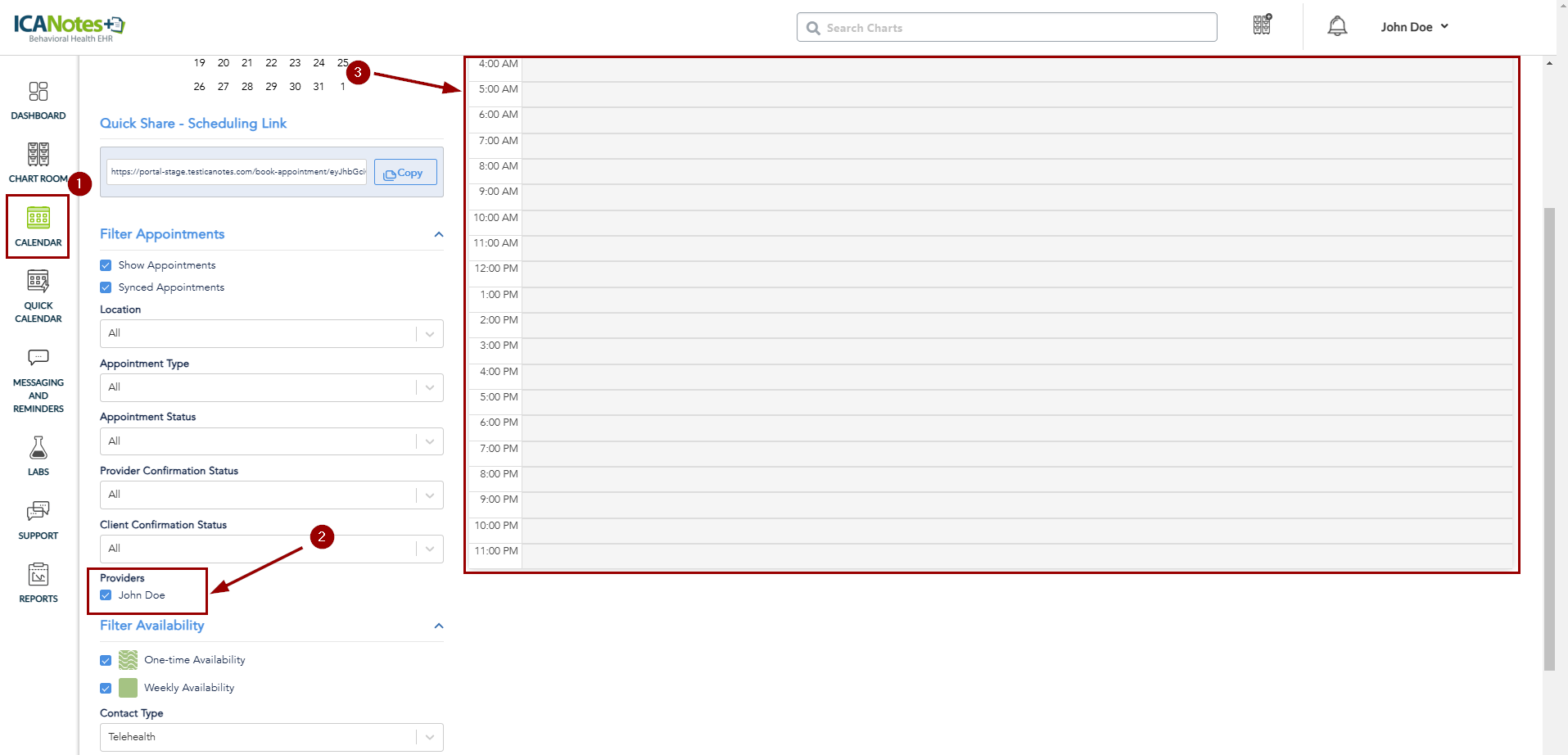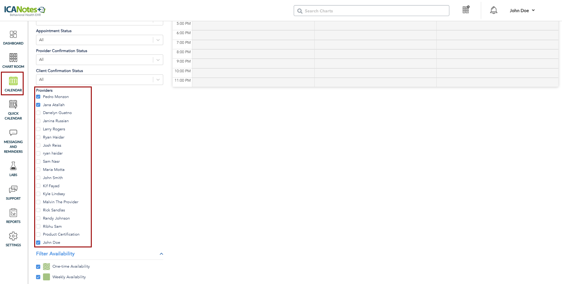 Users with this permission can view the calendars of all providers. Refer to the screen below for reference. As they select the relevant checkboxes, the providers' calendars will be displayed on the right side.