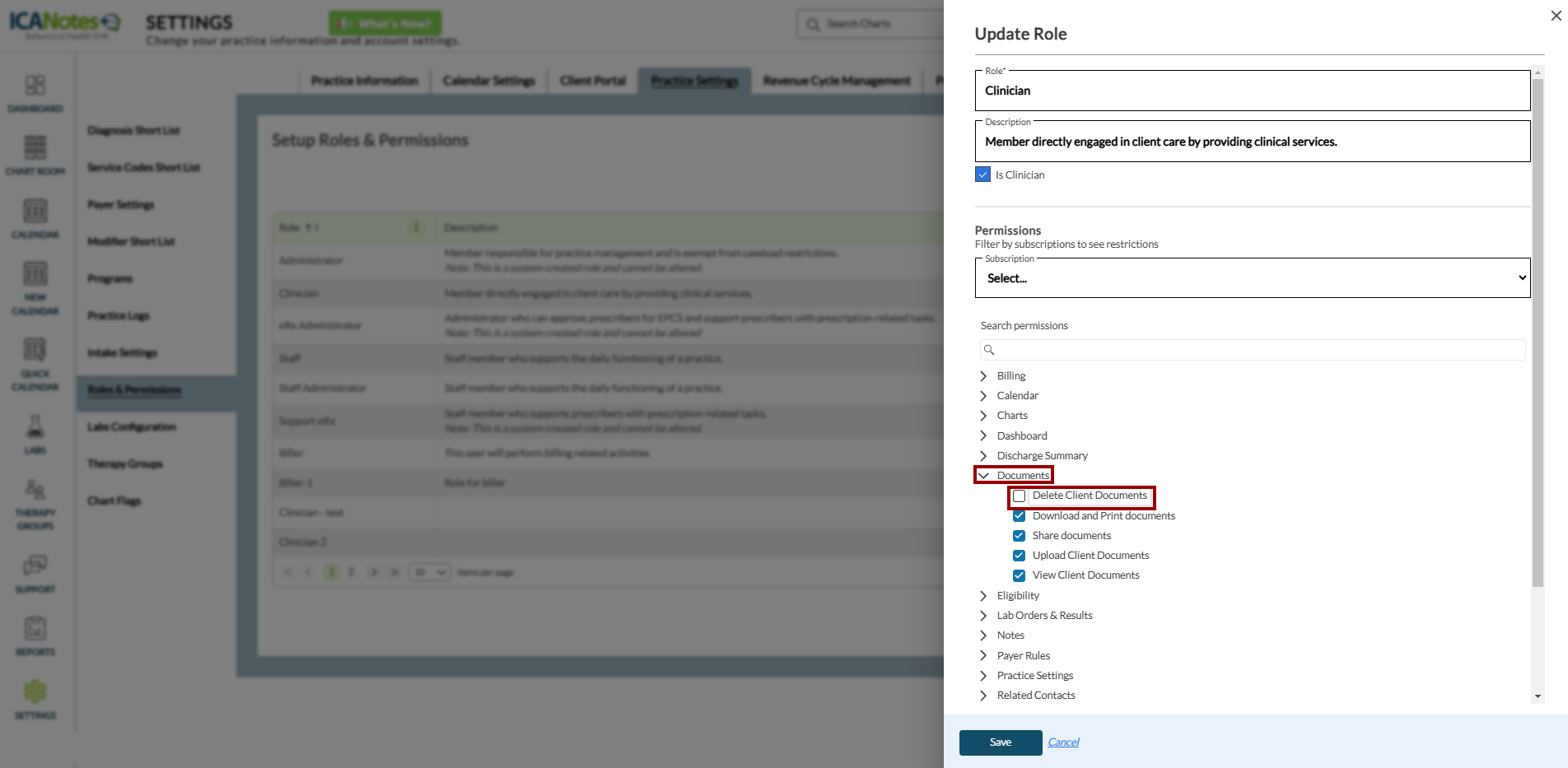Navigate to Chart Room > Documents tab and click the three dots on the far right side to access the Delete option.