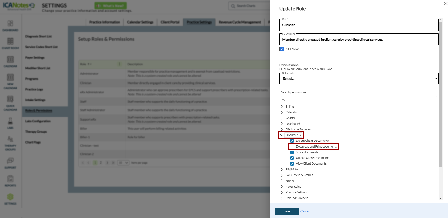 Navigate to Chart Room > Documents tab and click the three dots on the far right side to access the Download and Print options.