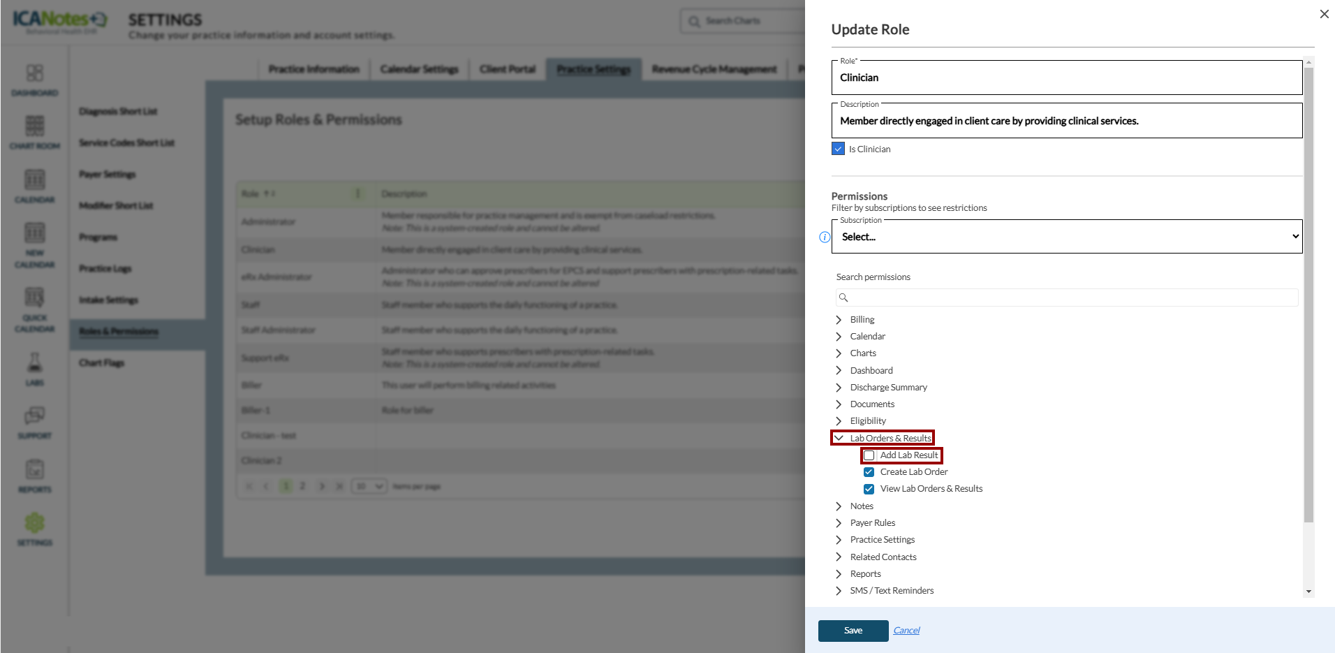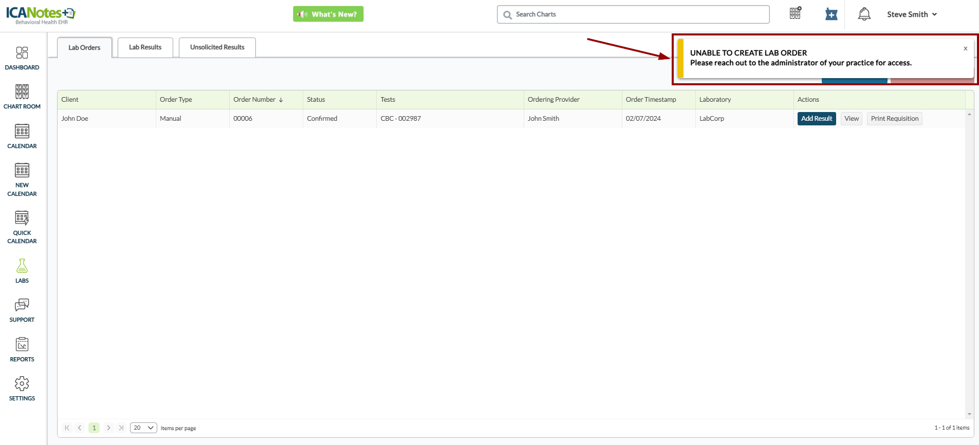 Users without this permission attempting to add lab result will receive the following restriction message.