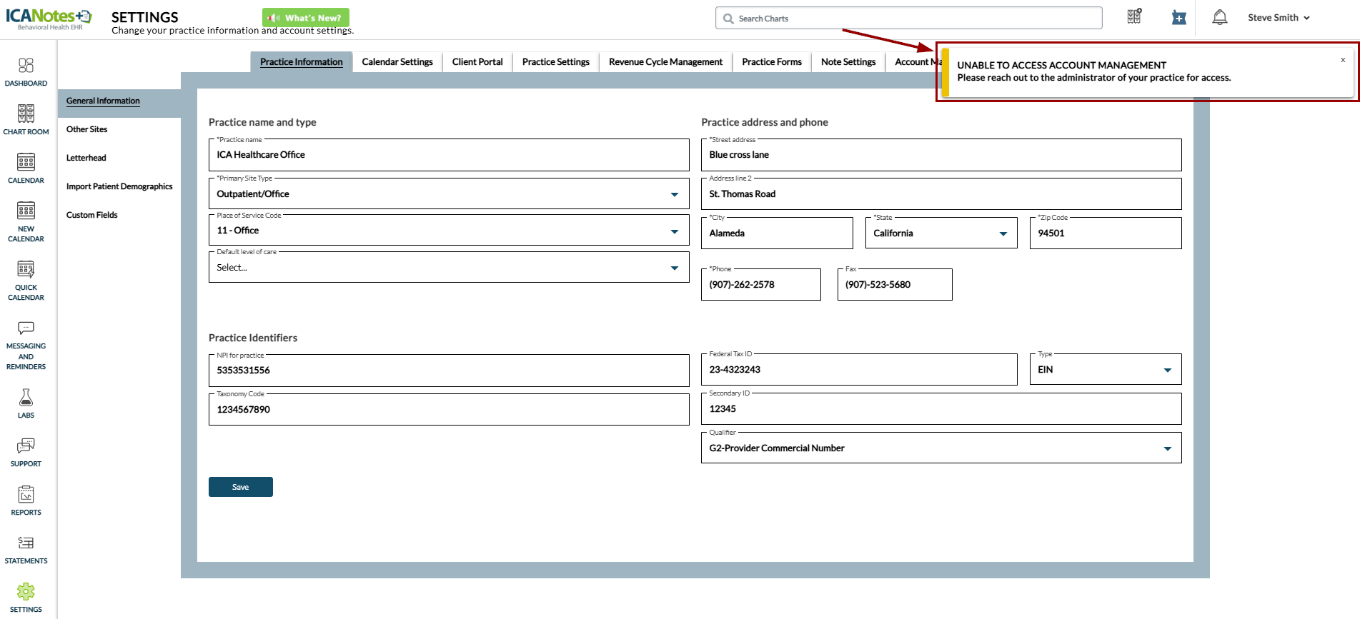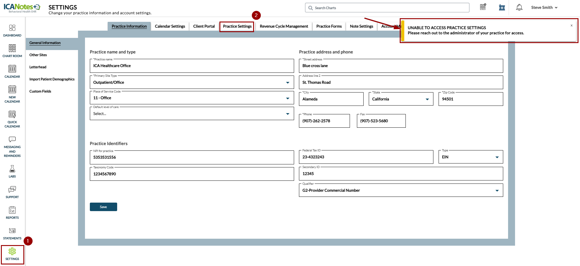 Users without this permission who attempt to access the Practice Settings tab in Settings will encounter a restriction message. See the following screenshot for reference: