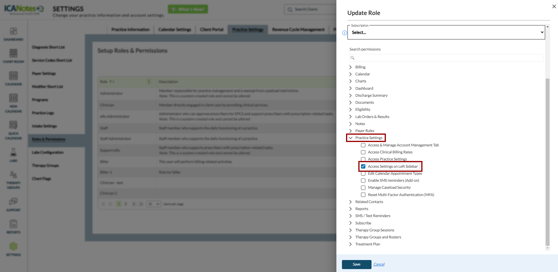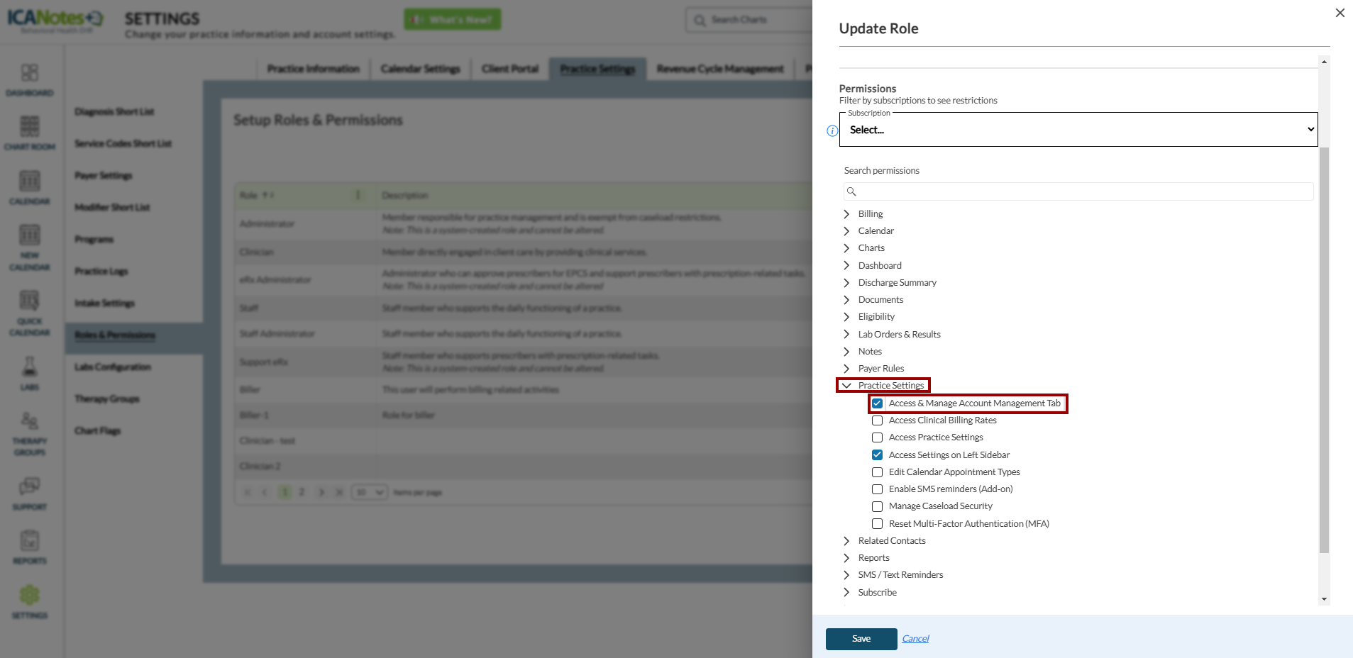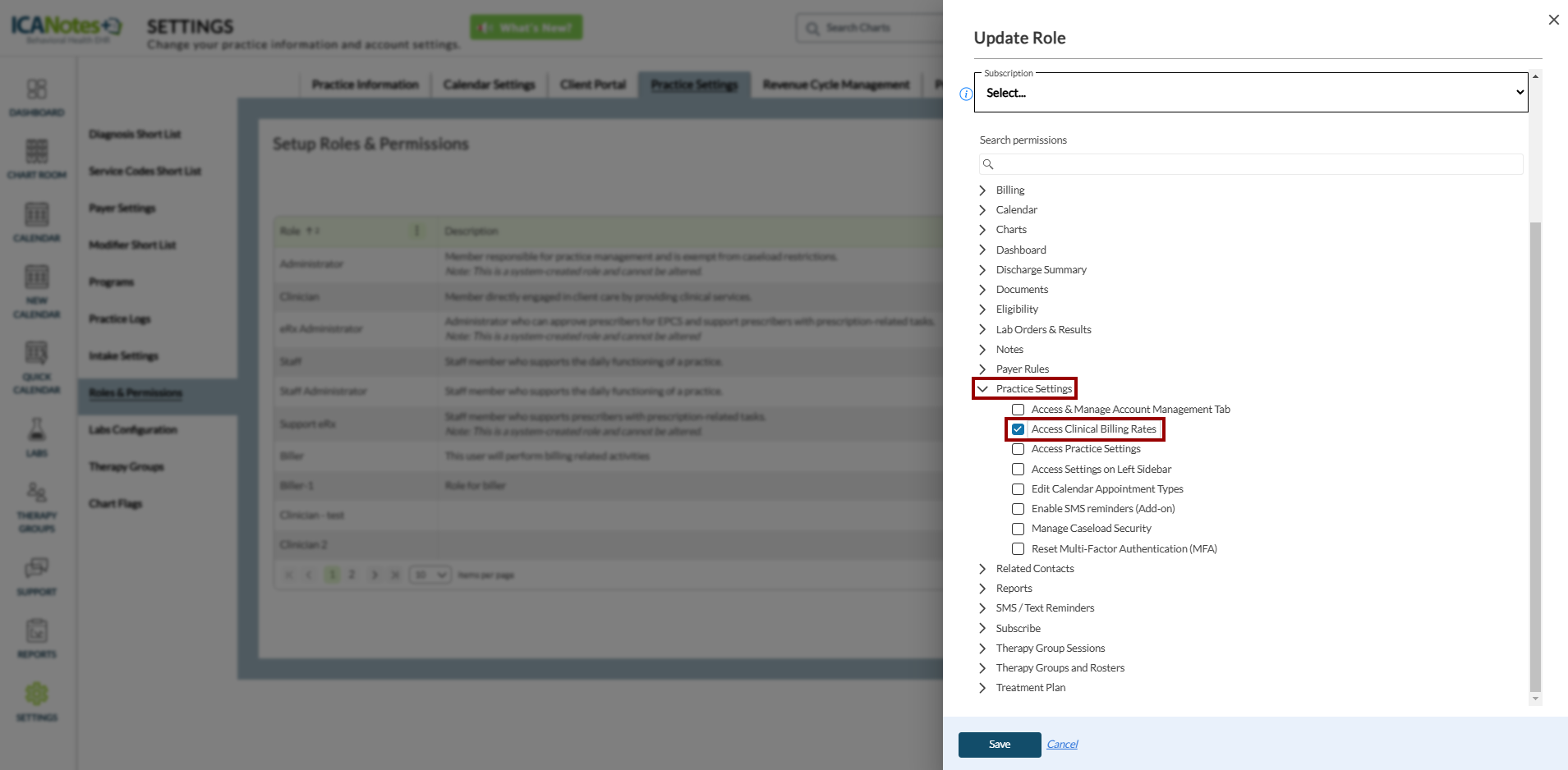 Users without this permission won’t see the Clinical Billing Rates section in Settings > Revenue Cycle Management.