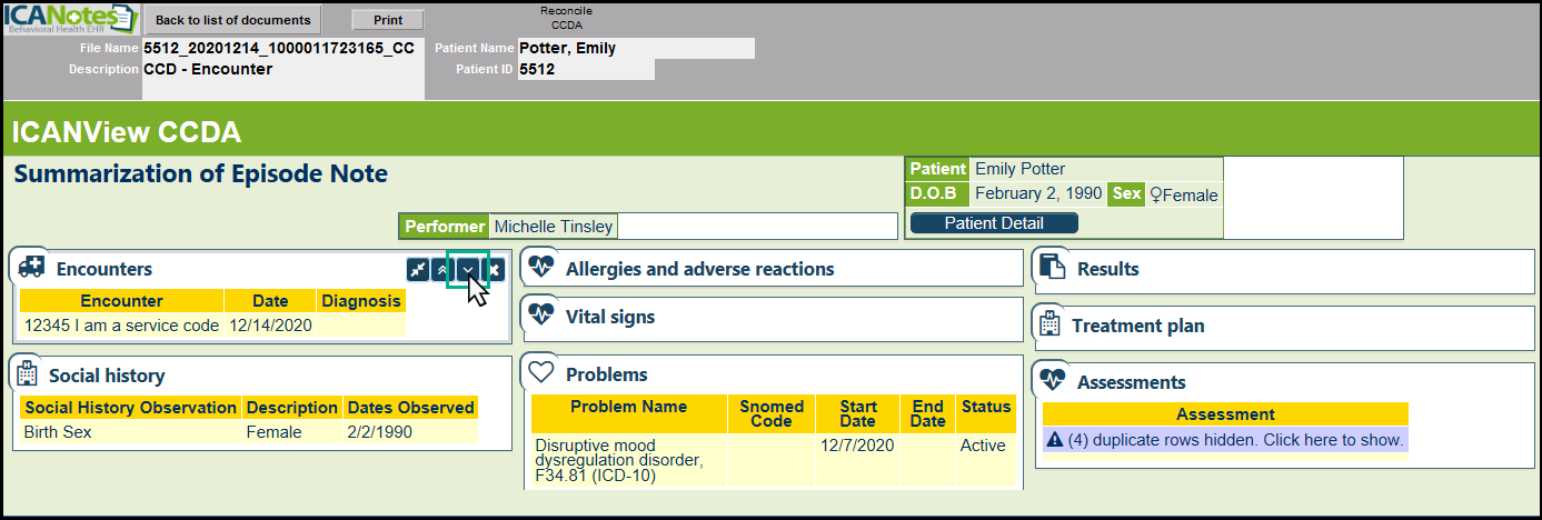2. Within Clinical Documents, the following areas can be pulled up in the ICANView CCD Renderer. Look to ensure the file is an .xml and the category is Continuity of Care.