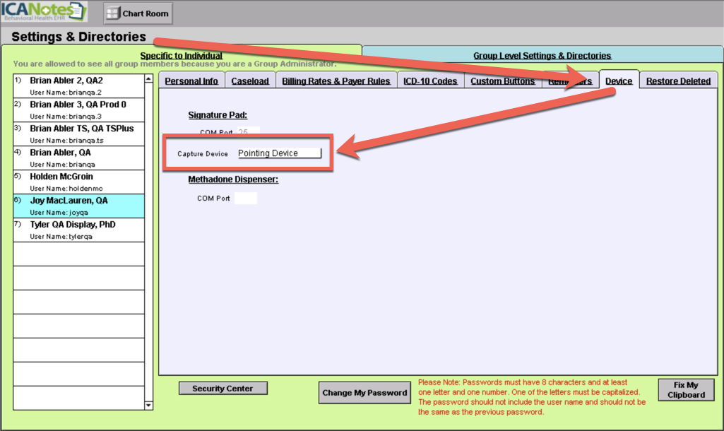 With this group rule turned on, individuals may need to switch between Topaz Pad signing and Pointing Device signing. This can be done through Settings and Directories.