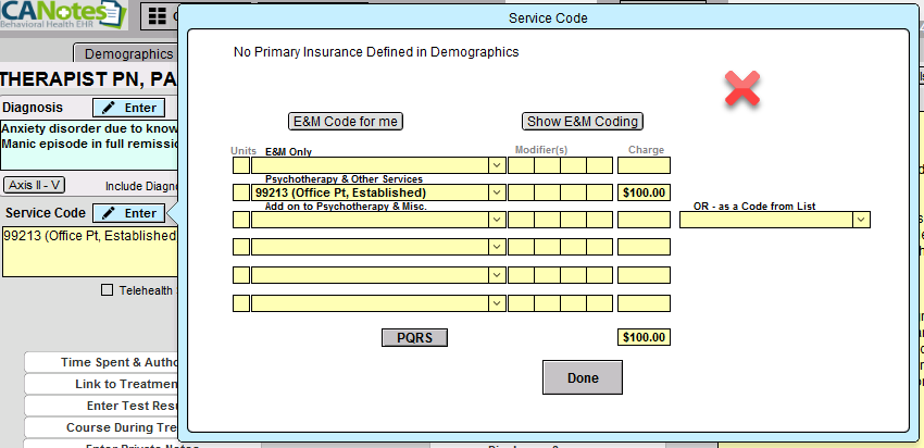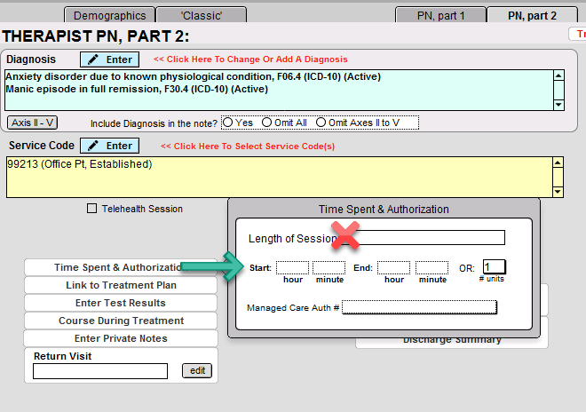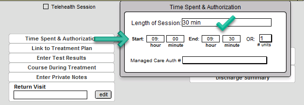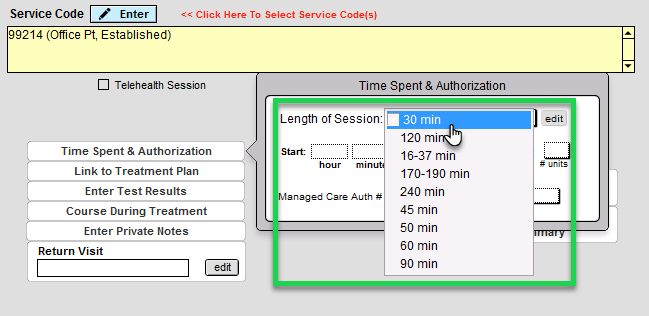 We've created a group rule, "Read Only Time Spent with Patient". When enabled, the Time Spent fields within the work areas of a note will be read/display only and the "edit" button will be hidden from view. The "Time Spent" button in the Service Code popover will also be hidden from view. Instead, the note owner/provider can use the Start and End time fields accordingly to populate Length of Session. Entering start hour, start minute, end hour, end minute will populate a Face to Face Time with Patient and/or Family & Coordinating Care minute value automatically.