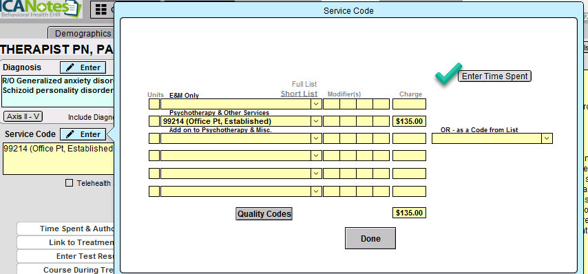 Likewise, when the Read Only Time Spent With Pt group rule is enabled, the Time Spent button will not be visible in the Service Code popover.