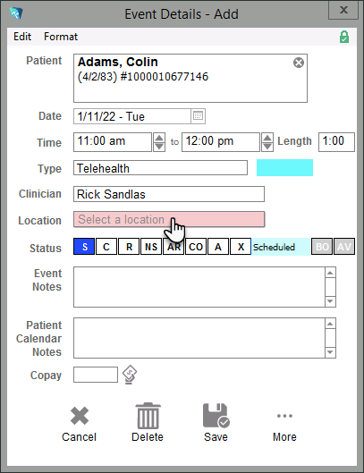 Security Administrators can enable a group rule which will, when enabled, require a Location to be selected within the event details before the appointment can be saved (new or existing). If the appointment is saved before the Location field is set, the field itself will remain highlighted in red until a Location is set.