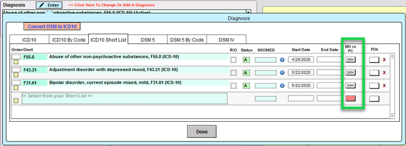 MH vs PC can also be set when adding a new diagnosis code from a note. Click into the field and make a selection: