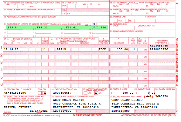 After prepping the claim (Primary with Secondary) in the Billing/Productivity Report, we see on the paper CMS 1500 that only the diagnoses marked MH or Both are included due to the note owner's Provider Type being set to Mental Health, excluding the PC diagnosis code.
