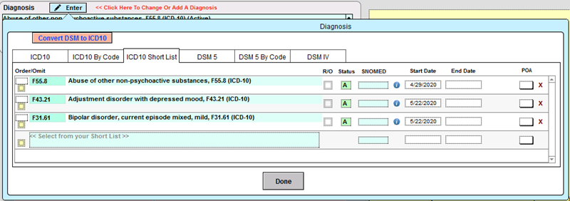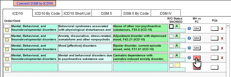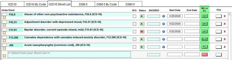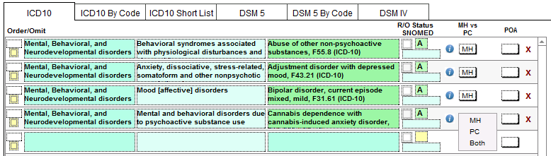 For example, this sample patient has five (5) diagnoses marked as a mix of MH, Both, and PC: