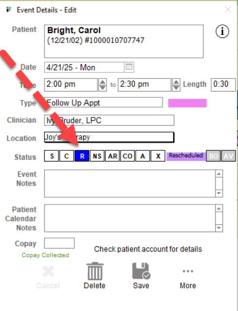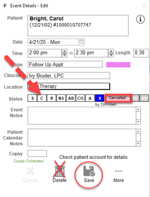 Cancelling: To cancel a patient appointment, open Event Details and change the status of the appointment to Cancelled (X) rather than deleting the appointment from the Calendar. Appointment deletion may result in patients still receiving a text message reminder.