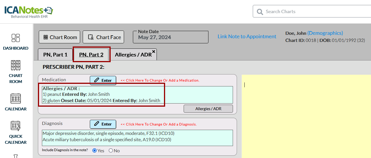 The allergy details can be accessed from the PN, Part 2 tab on the Progress Note, as depicted below: