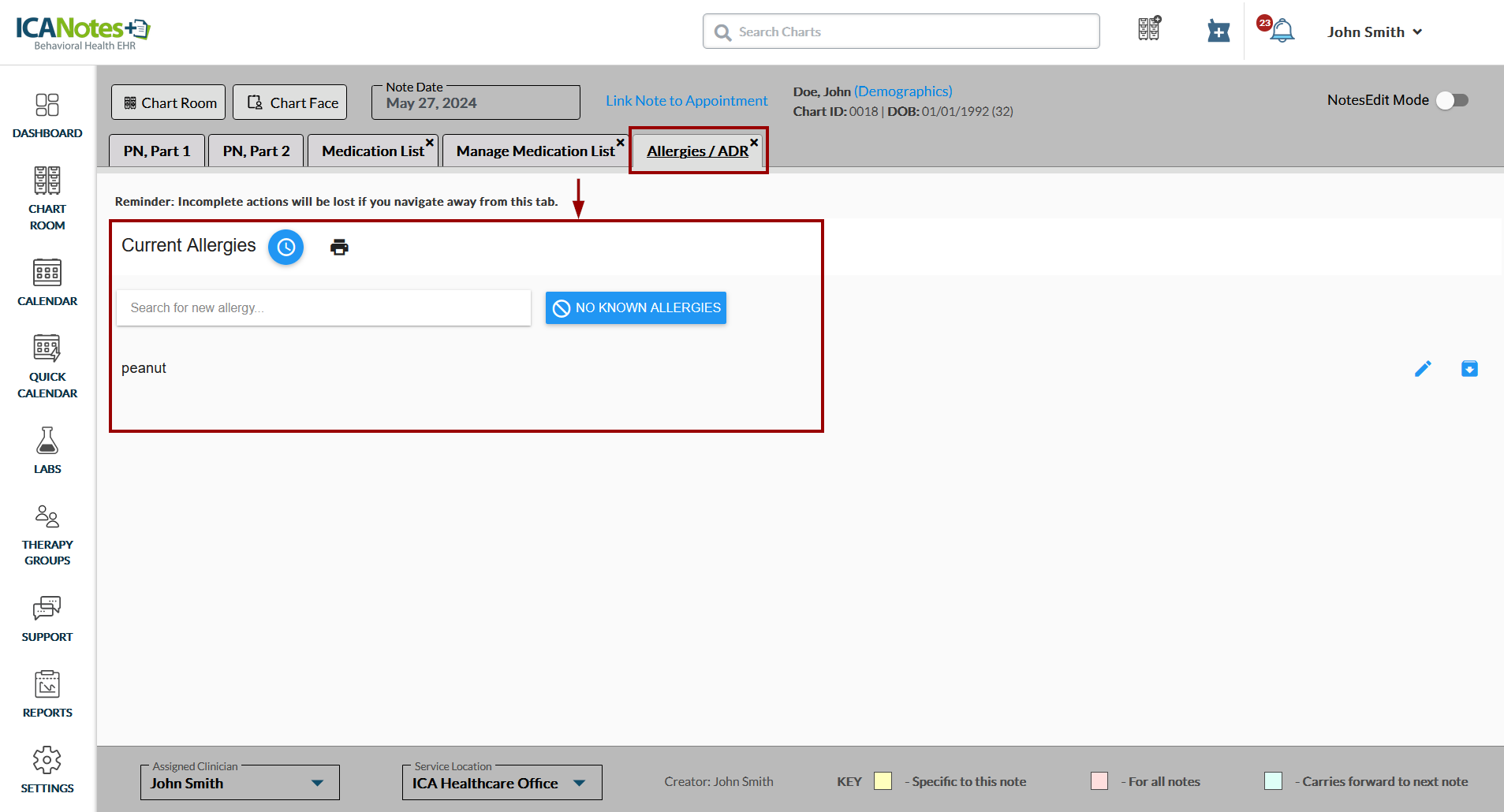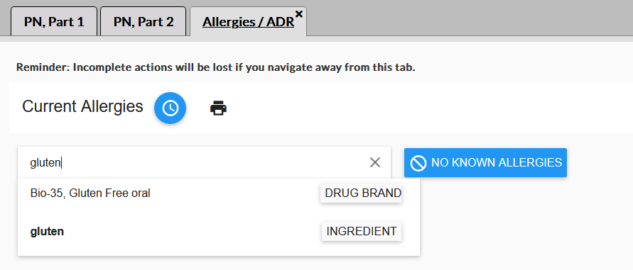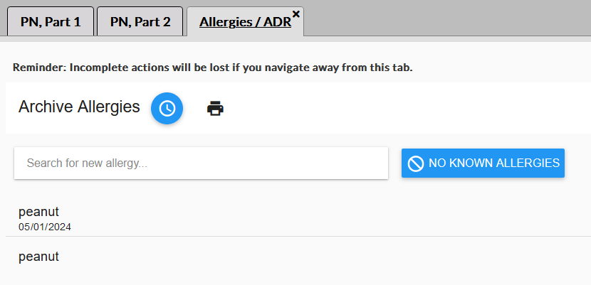 The Allergies / ADR tab opens and displays a list of allergies recorded for the client. When the client is not allergic to any food or drug, you can select the No Known Allergies option.
