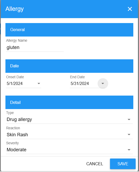 On the Allergy screen, select the onset date and end date for the allergy. Record other details such as allergy type, reaction, and severity in the screen below.