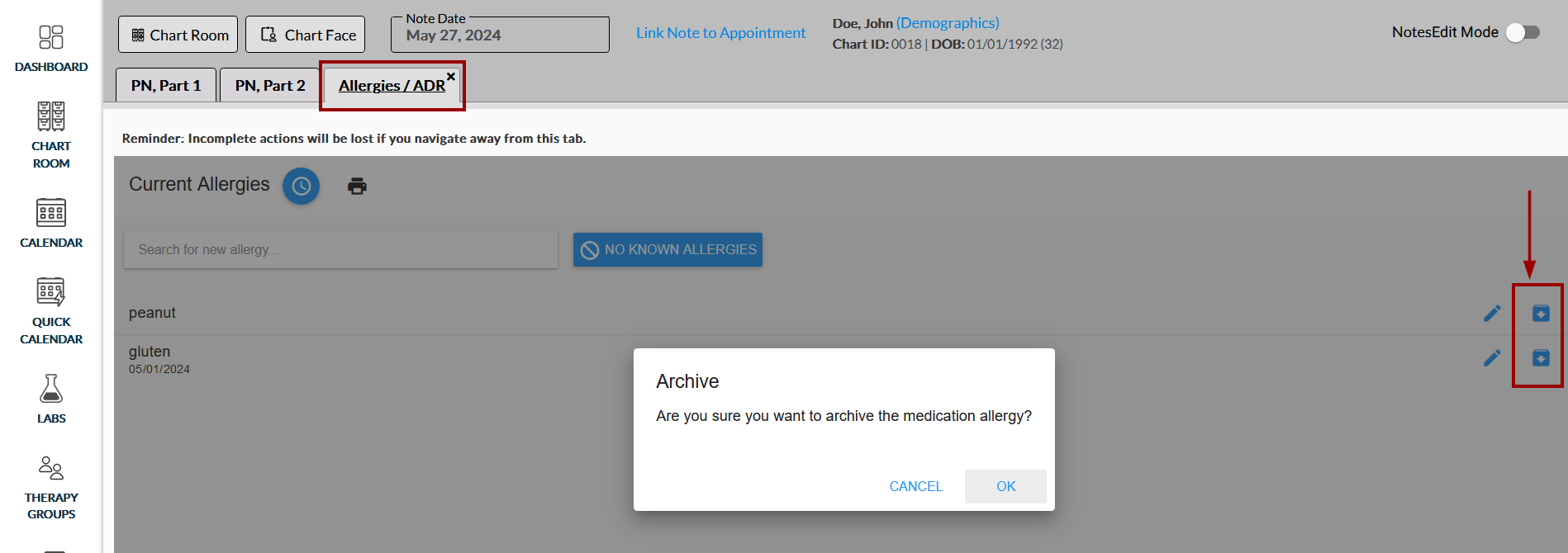 On the Allergies / ADR tab, click the Archive icon from the extreme right side. A confirmation message appears to archive an allergy as shown below: