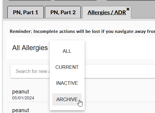 To access the archived allergies, click the icon and select the Archive option from the list.