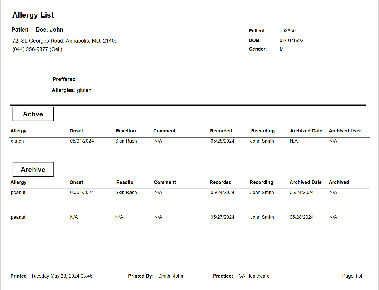 This opens the Patinet Allergy Report displaying client's active and archived allergies.