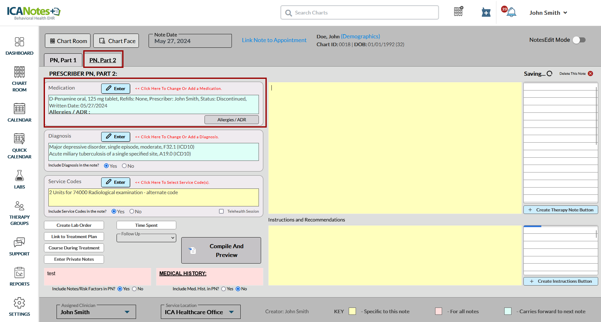 Navigate to the client's chart and create a progress note. Within the PN, Part 2 tab on the Progress Note, locate the Medication box as highlighted in the screen below: