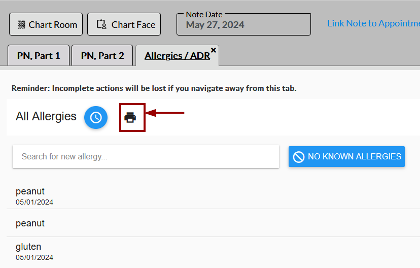 On the Allergies / ADR tab, click the printer iconfrom the top as shown below.