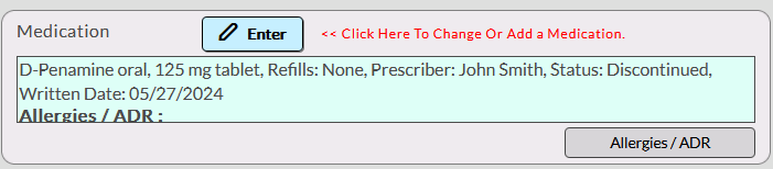 In the Medication box, you can view prescribed medications and allergies recorded for the client. To add a new allergy, click the Allergies / ADR button.
