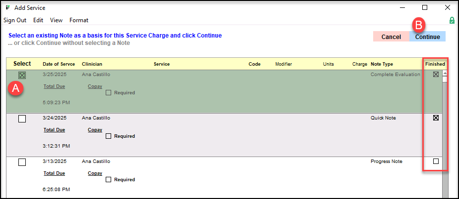 On the Add Service window, finished notes are indicated in the right column (see red square).