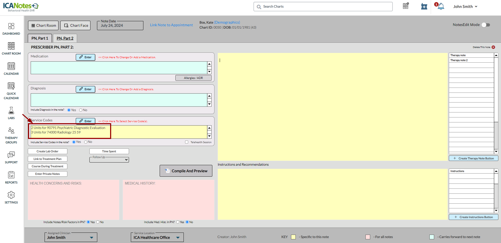Once the service codes and the billing rates are configured at the practice level, you can add the service codes within the notes, change the units, and the charge amount as needed.
