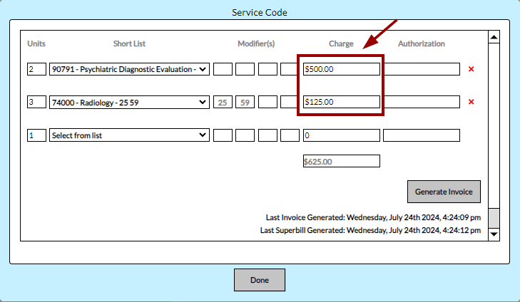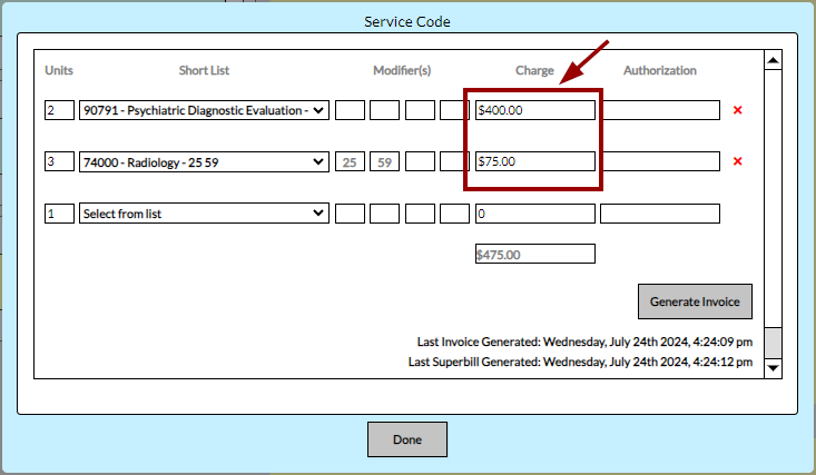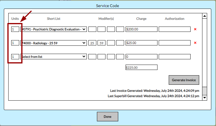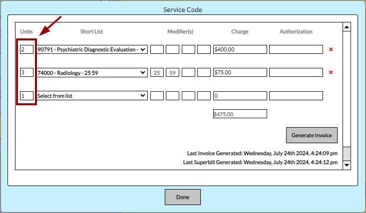After you modify the units and charge amounts, click Done. You will see the following screen with the updated number of units for each service code.