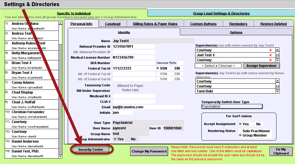 To add a new user, click on the “Security Center” button. You will be prompted to enter your ICANotes password to proceed.