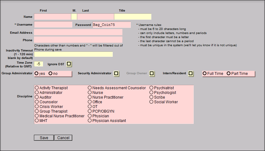 On the following screen, fill out all of the required fields in pink; yellow fields are optional. The username must meet the username rules requirements to allow the system to save the changes.