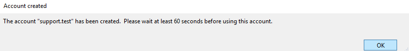 You will encounter a notice that the account has been created and the user must wait 60 seconds before using the account.