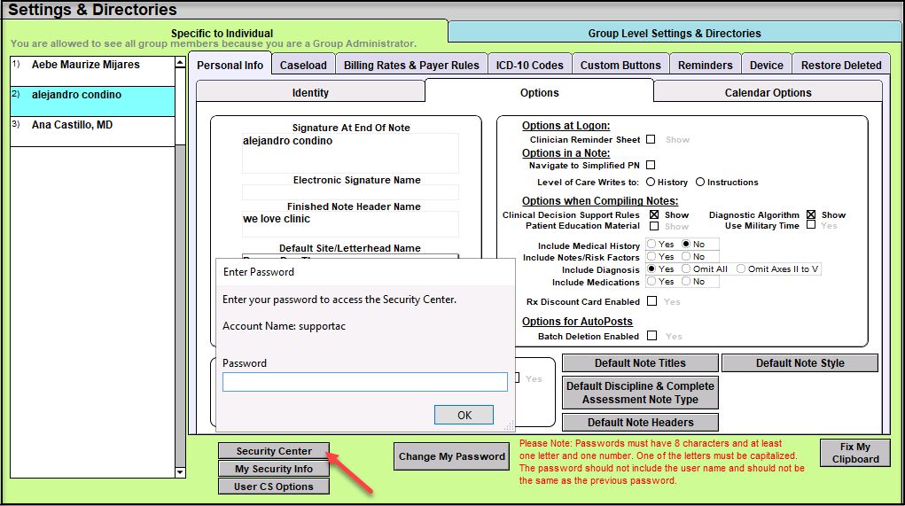 2. Click "Security Center" and enter your ICANotes password.