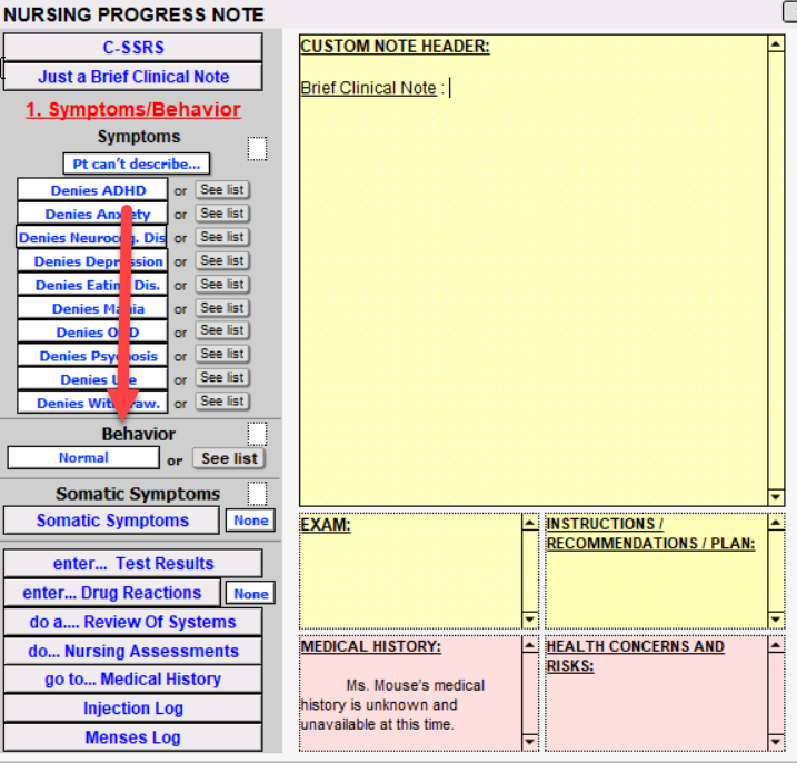 Next, let’s move on to Symptoms/Behavior. Simply click "Denies Symptom" If the patient doesn't have a specific symptom, otherwise select the associated "See list" button to input symptom-specific sentences into the body of your record. Remember to work from top to bottom of each list’s shrub to capture data in the most logical fashion.