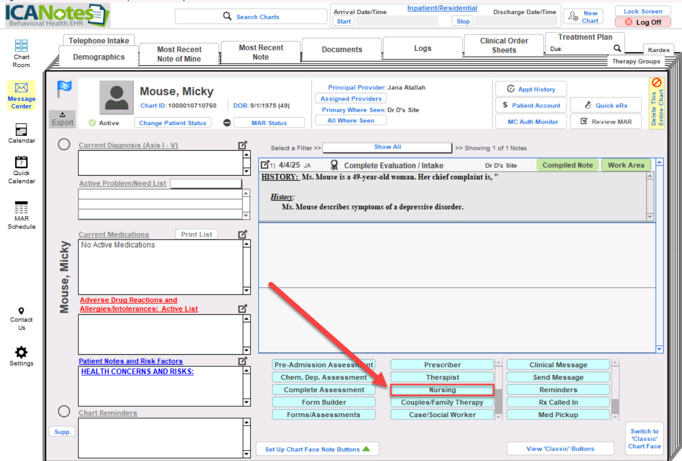 As you access the Chart Face, go to the notes options and select the Nursing option marked in red.