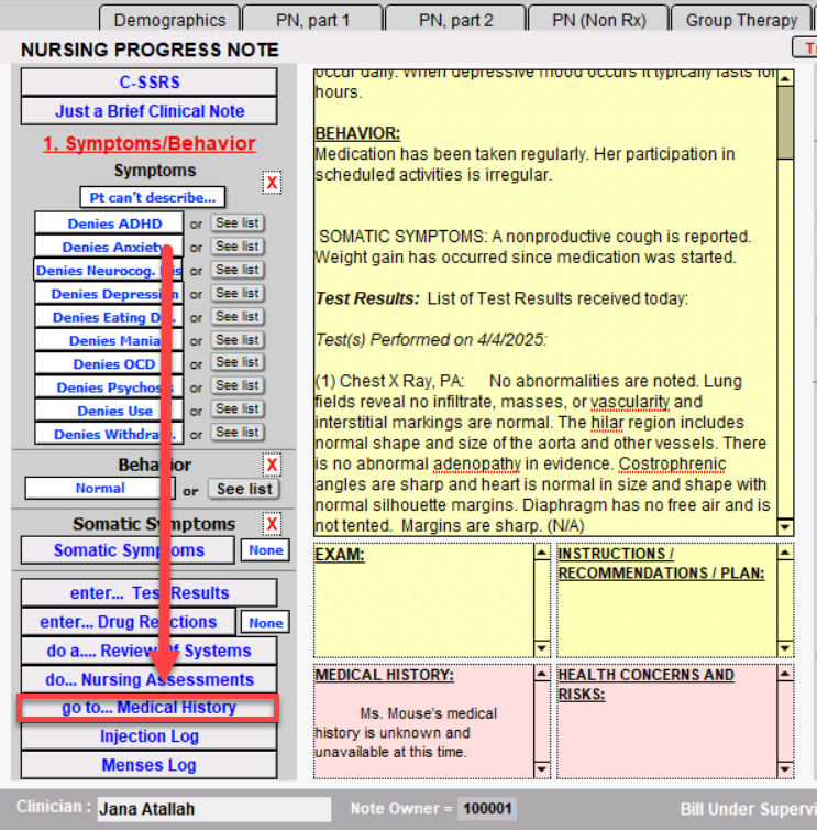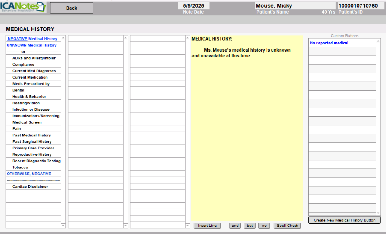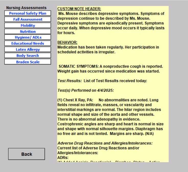By clicking to go to... Medical History button, you enter the MEDICAL HISTORY window. You can enter a medical history or edit an existing one. Click the Back button to return to the Nursing Progress Note.