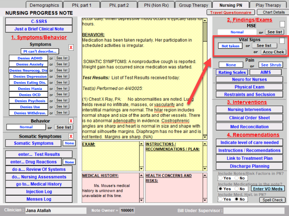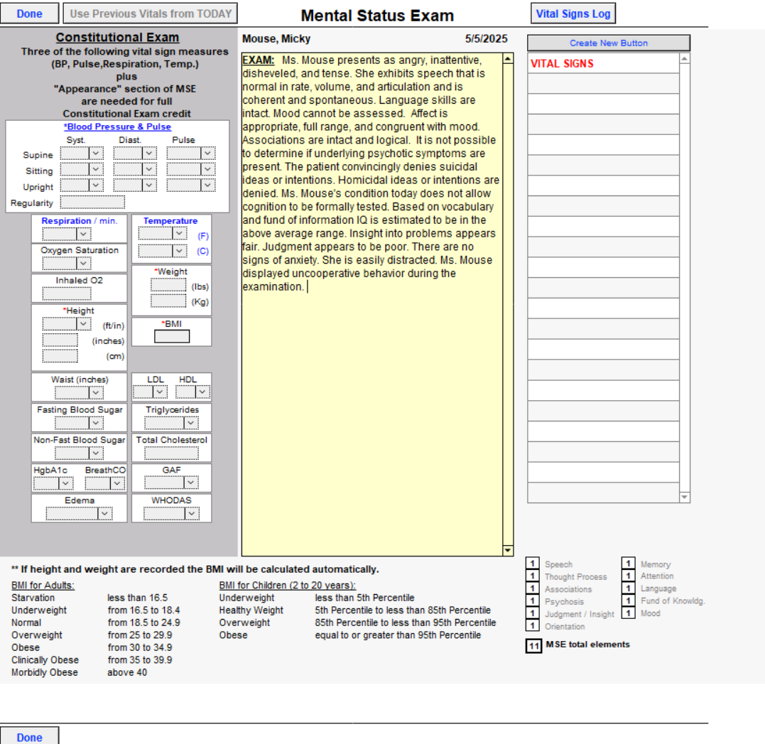 If you did not document the vital signs in the Mental Status Exam area, click on the Vital Signs button to enter the Constitutional Exam window. Blood pressure, pulse, respirations and height, and weight to achieve calculated BMI. FBS, LDL, GAF, and waist measurements are entered with a click. If vital signs are not taken, you can click the Not Taken button.