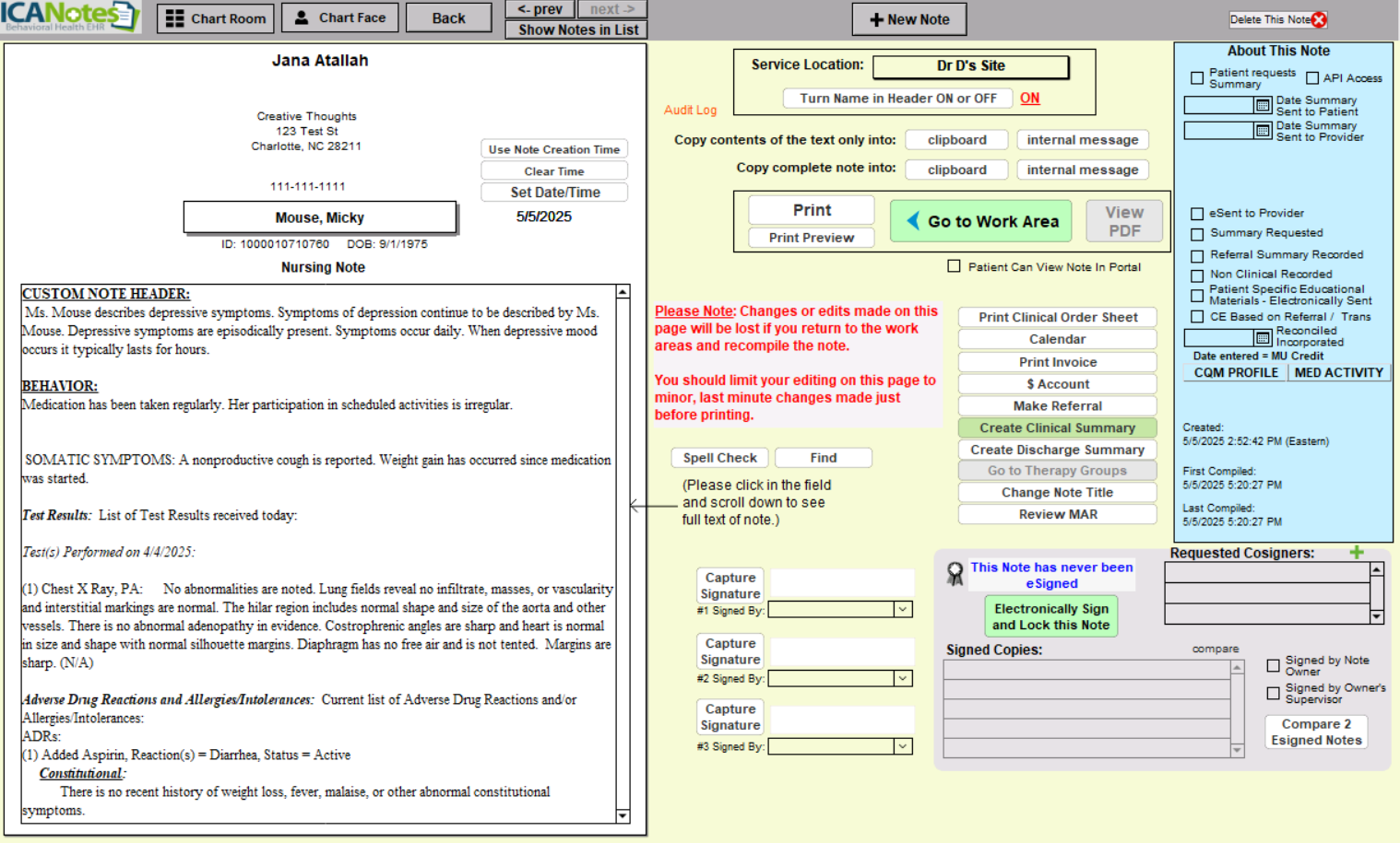4- Once you compile your note, you will be taken to the Preview Compiled Note Screen. As you can see, there are a number of options on the right. Most are self-explanatory, but you should take note of the spell check button, just under the red text in the screenshot above, which will check your finished note for spelling errors.