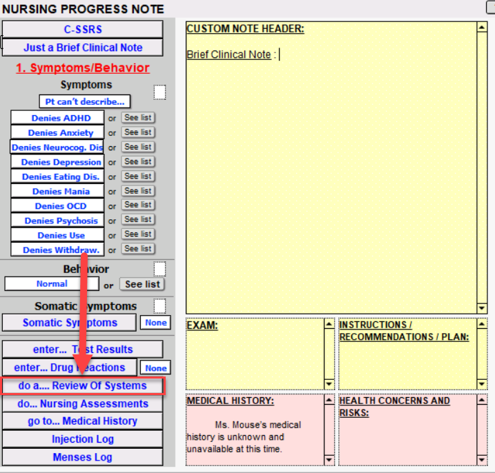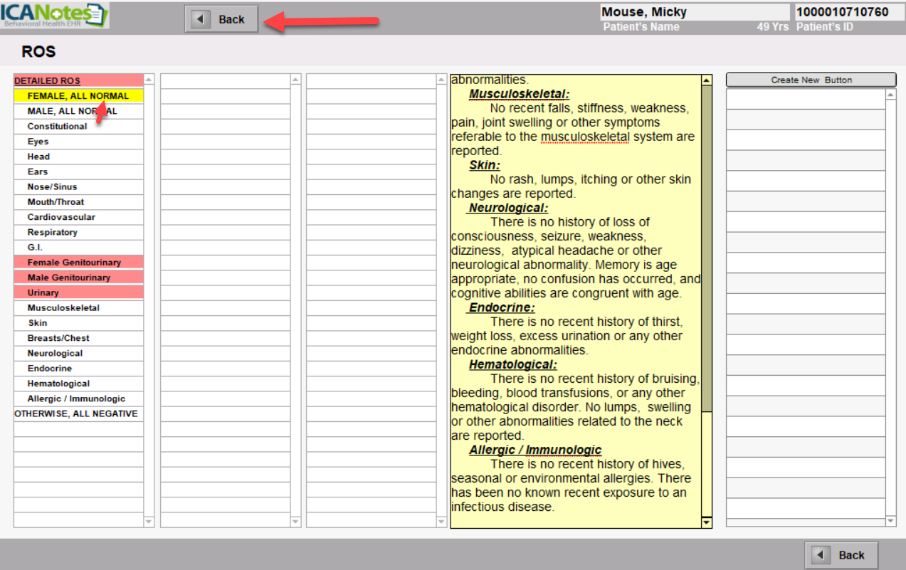 Click the do a... Review Of Systems button to document the review of systems. Within the ROS window, you are able to choose all normal or document per system if there is an abnormality using the shrubs. Click the Back button when done.
