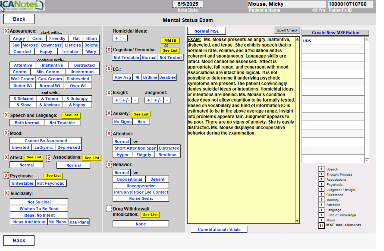Let’s work our way down Column 2. Hitting the Normal button will insert a normal mental status exam status. Clicking the See list button will take us to the Mental Status Exam page.
